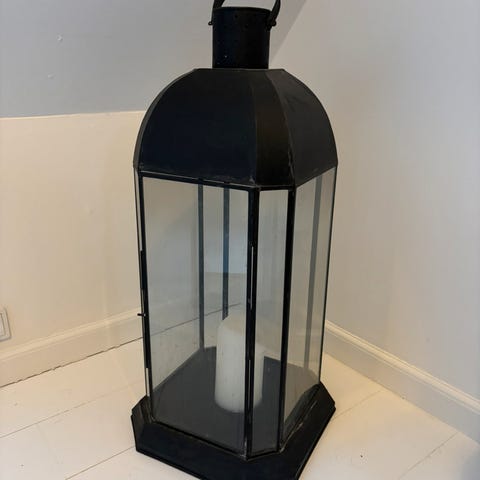 lanterne med lys. Lanterne i metal med glas sider og perforeret top samt bærehank. Indvendigt medfølger et cylinderformet lys fra Sirius i hvid plast. Velegnet som dekoration indendørs eller på overdækkede udendørsområder.