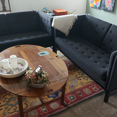 Sofaen står flot, Burde kunne renses, så den bliver endnu pænere, men har ikke undersøgt det nærmere..