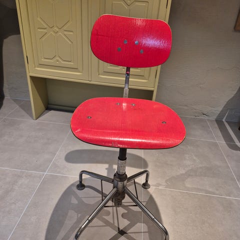 Flot gammel retro skrivebordsstol/ kontorstol i smuk koboltblå farve. Stolen har patina men er i virkelig fin stand og med den oprindelige fodstøtte i sortlakeret metal. Den vil pynte på ethvert kontor, i værkstedet eller som alternativ spisebordsstol. Den kan selvfølgelig justeres i højden.