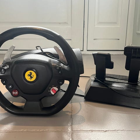 Thrustmaster TMX racerrat med tilhørende pedalsæt. Sættet består af et sort rat med integrerede knapper og skiftepedaler bag rattet samt en separat pedalbase med tre pedaler. Velegnet til bilspil, hvor der ønskes mere præcis styring med rat og pedaler frem for almindelig controller eller tastatur. Rattet tilsluttes med kabel. Sælges som komplet sæt med rat og pedal enhed.