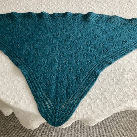 Ca. 175 cm i bredden og 80 cm i længden, plus frynser.