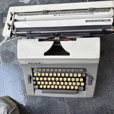 Antares skrivemaskine i grå nuance med lysere top og mørkere bund. Mekanisk maskine med standard tastatur og vogn med lineal og marginkontroller. Egnet til skrivning af breve, noter og andre dokumenter på papir. Velegnet som funktionelt arbejdsredskab eller som indretnings- og samlerobjekt.