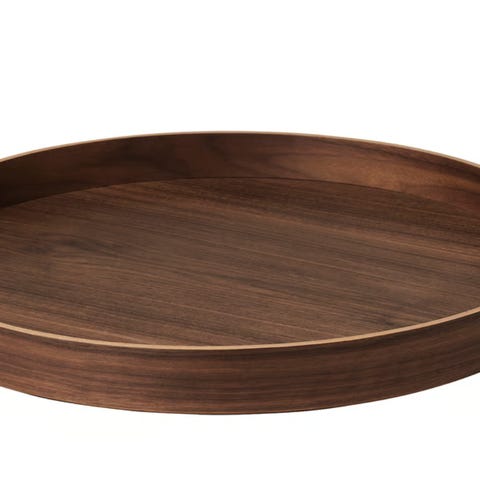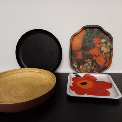 Pæn rund lyseblå bakke i bambus. Med 2 hanke.