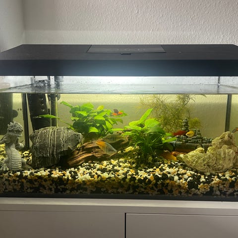Sælger denne akvarie med hjemmelavet låg. Lågen kan dog nemt fjernes hvis man ikke ønsker den.