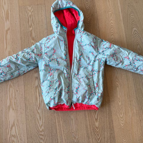 Fin outdoor jakke til barn (ca. 8 år) købt fra ny og brugt en sæson. Ingen defekter, men små pletter, som vist på billedet. Deraf prisen. De er ikke meget synlige, men kan muligvis klares med pletrens.