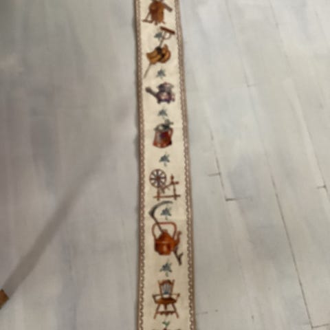 Fin broderet klokkestreng med ophæng og klokke. Broderi med jagtmotiver, . 123 cm lang inkl. beslag