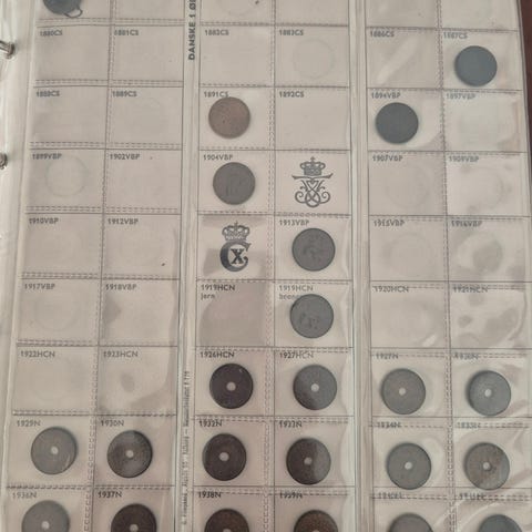 Samlingen består af mange danske mønter i poser og ruller – øre og kroner i forskellige størrelser og årgange. Der er både gamle og nyere mønter, så der er masser at gå på opdagelse i.