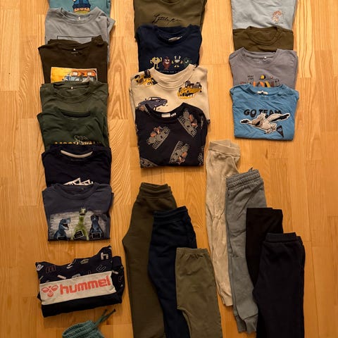 Tøjet er primært i blå nuancer og fra forskellige mærker, herunder H&M, Hummel mv.
