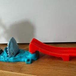 Hot Wheels dinosaurus racerbane med loop og affyringsrampe. Sættet består af en blå dinosaurus-figur som base, orange racerspor med loop samt en startstation. Der medfølger flere små Hot Wheels-biler, som kan køre ned ad banen og gennem loopet.