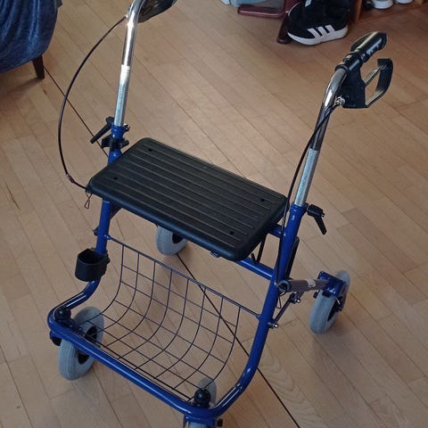 Rollator med kurv og sæde i grå farve. Modellen har fire hjul og ergonomiske håndtag med bremser. Foran er der en metaltrådskurv til opbevaring af indkøb eller personlige ejendele. Midt på rollatoren er der et fast sæde i plast, som kan bruges til korte pauser.