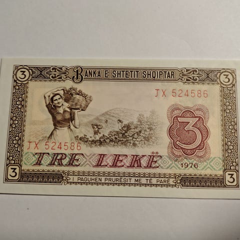 Banka e Shtetit Shqiptar 10 lek seddel fra 1976. Forsiden viser en gruppe mennesker foran en bygning samt portræt i højre side og pålydende værdi 10 lek. Bagsiden viser en kvinde ved tekstilmaskiner samt pålydende værdi 10 lek og serienummer. Seddelen er trykt i grønne og brune nuancer med dekorative rammer og albansk tekst.flot kvalitet 0
