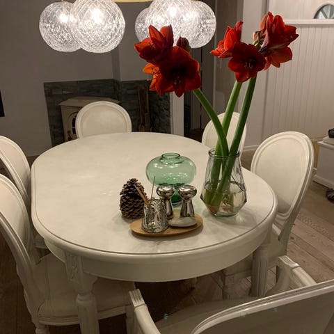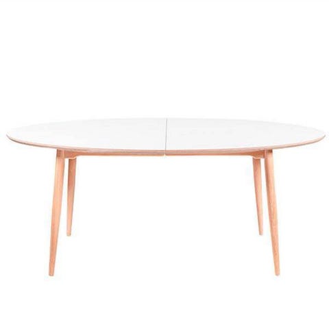 elfenbensfarvet ovalt spisebord med 8 matchende stole