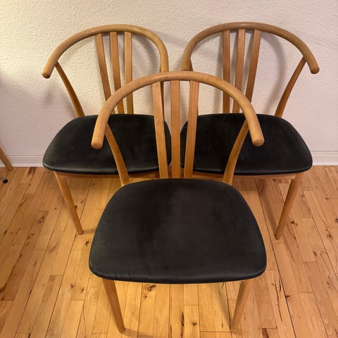IKEA spisebordsstole med formstøbt plastskal og polstret sæde. Stolenes sæder er i en lys, neutral farve og understellet består af træben. Egnet som spisebordsstole i køkken eller spisestue. Designet giver en enkel og funktionel siddeløsning til daglig brug.