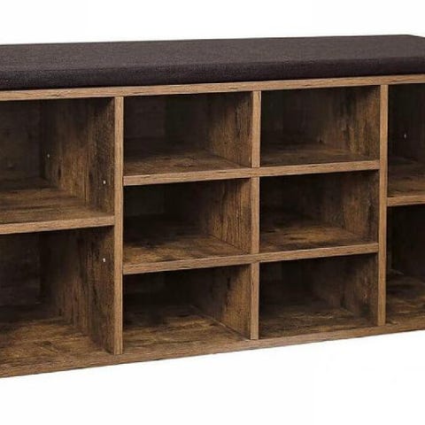 Byd hjemmet velkommen med en stilren skobænk, der kombinerer varm rustik brun overflade med en robust sort metalramme. De to net-hylder giver plads til at organisere hverdagens fodtøj, mens den lange topplade kan bruges til tasker, nøgler eller til at sidde og binde snørebåndene.