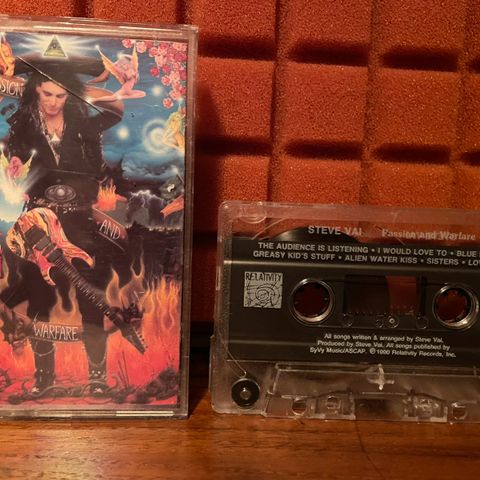 AI: Steve Vai Sex & Religion kassettebånd. Originalt album udgivet på kassette med gennemskinneligt plastbånd og trykt cover. Inkluderer kassettebånd i plastkassette samt indlæg/cover med trackliste og trykte tekster. Velegnet til afspilning på kassettebåndoptager eller som supplement til en samling af rock- og guitarudgivelser på analogt format.