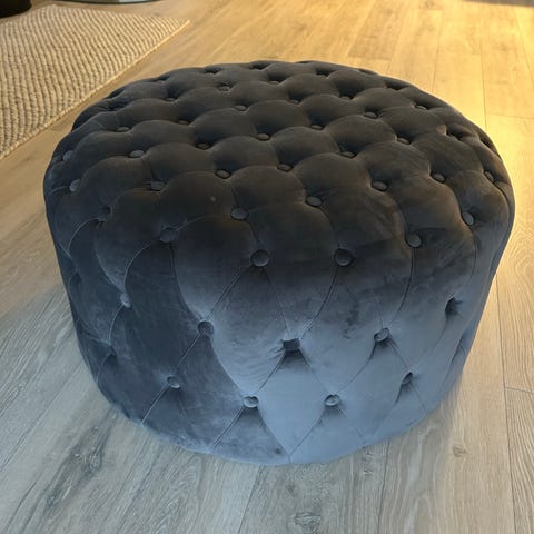 Jotex rund puf med polstret sæde i blå velour og stel i guldmetal. Puffen har åben, cirkulær metalbase med lodrette stænger, som giver et let og moderne udtryk. Velegnet som ekstra siddeplads, fodskammel eller lille sofabord med bakke ovenpå i stue eller soveværelse.