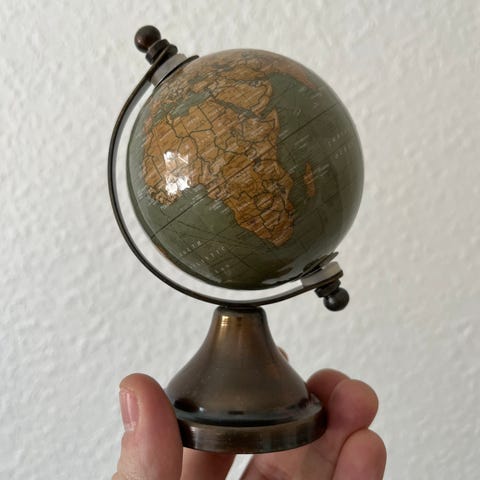 Sæt af to dekorative verdenskortglober i klassisk vintage stil, lavet af metal og resin, hver cirka 21 x 15 x 13 cm og cirka 0,7 kg, i næsten ny stand og ikke beregnet til uddannelsesbrug. Klik på den blå "gå til varen" knap, for at købe eller byde på denne vare. Den samlede pris vil blive vist inden du afgiver dit bud.