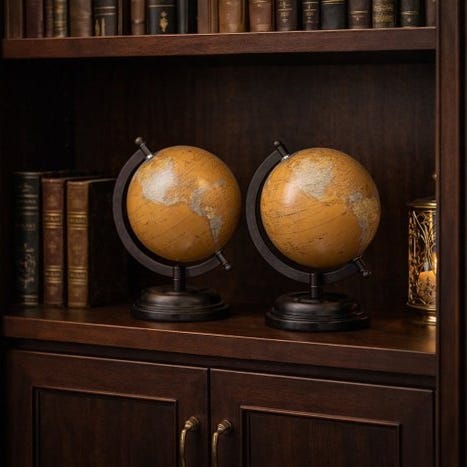 Elegant sæt af to dekorative verdensglober i en klassisk vintage stil, perfekt som et raffineret interiøraccent. Det matchende par er ideelt til at skabe symmetri på et sidebord, skab eller skrivebord, og tilføjer balance og visuel harmoni til ethvert rum. Et tidløst dekorativt sæt, der passer til både klassiske og moderne indretninger.
