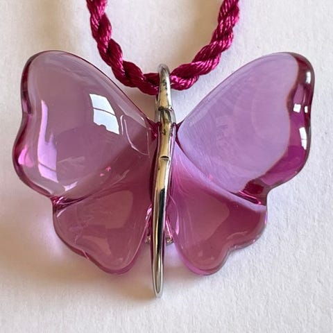 Ny Lalique sommerfuglevedhæng, vintage-model, med fuchsia krystalvinger og legering sølvkrop, kvindersmykke, mærke-smykke; mål 2,7 × 2,3 cm, vægt 5 g, oprindelse Frankrig, leveres i originalt forseglet emballage uden laboratorierapport. Klik på den blå "gå til varen" knap, for at købe eller byde på denne vare. Den samlede pris vil blive vist inden du afgiver dit bud.
