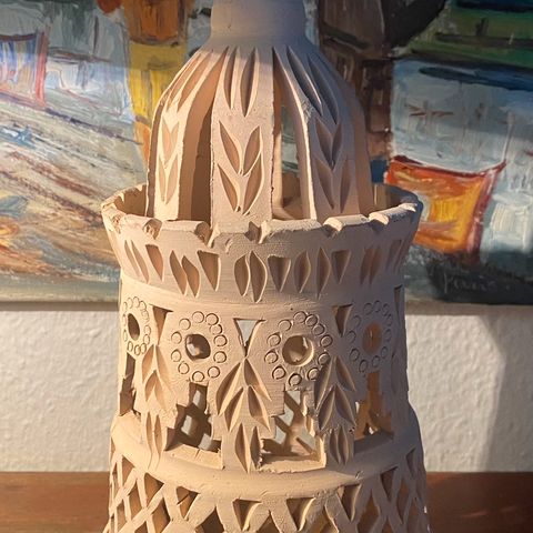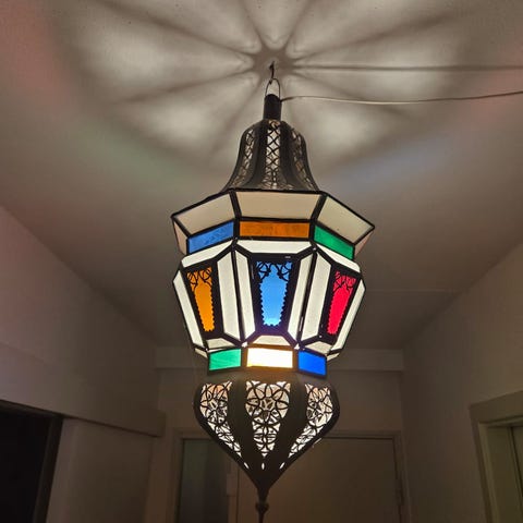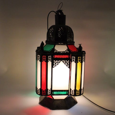 Dekorativ marokkansk lampe. Denne type lamper kaldes også fanous (fanoos). Lampen er 40 cm høj, og bredden og dybden er 20 cm. Lampen vejer lidt over 1,5 kg. Til denne lampe er der en kæde på 1 m.
