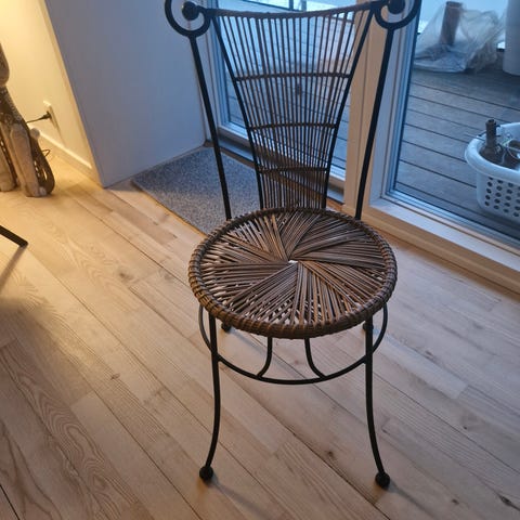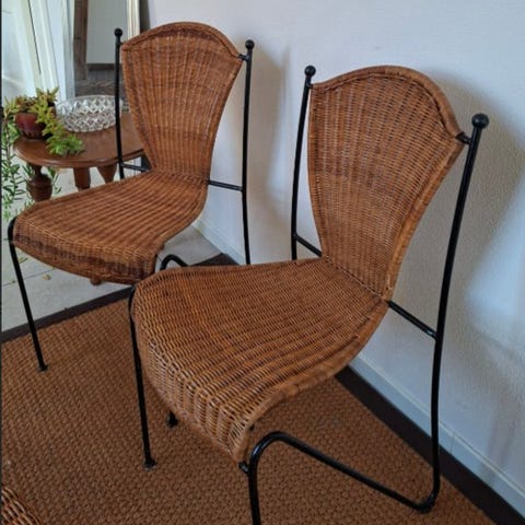 To stole i fransk midt‑century modern stil, designet af den amerikanske designer Frederic Weinberg, med sorte smedejernrammer og brune rattan sæder, oprindelse Frankrig og dateret til 1980‑1990, i god brugt stand med mindre tegn på alder og plettede pletter, mål 83 cm høj, 45 cm bred, 46 cm dyb, siddehøjde 47 cm. Klik på den blå "gå til varen" knap, for at købe eller byde på denne vare. Den samlede pris vil blive vist inden du afgiver dit bud.