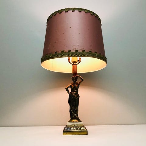 Bronze bouilotte lampe, model Bronze bouilotte lamp, i gang, inspireret af antikken, fremstillet i Frankrig og dateret til 1970–1980, højde 45 cm, bredde 22 cm, dybde 13 cm, i god stand med få overfladiske ældningsspor, dobbelt lampe og oval skærm i bronze/messing ikke inkluderet. Klik på den blå "gå til varen" knap, for at købe eller byde på denne vare. Den samlede pris vil blive vist inden du afgiver dit bud.