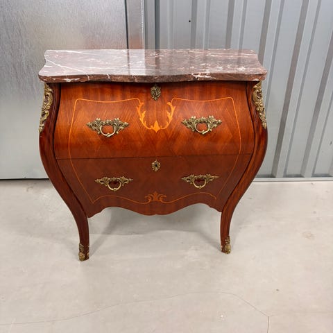 Kommode med originale låse og messingbeslag. Acacia træfinér med egbeklædte skuffer.