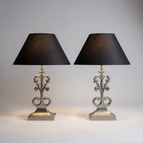 Den tunge firkantede fod giver stabilitet, mens den runde åbne kerne skaber en legesyg og rumlig effekt. Lamperne er udstyret med cylindriske stofskærme i en neutral nuance, der giver en varm, stemningsfuld belysning.