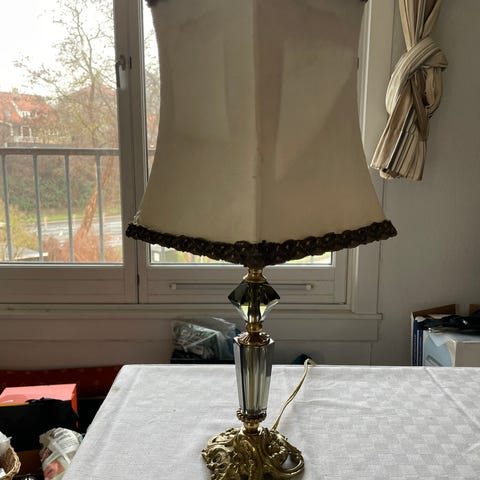 Antik bordlampe fra første halvdel af det 20. århundrede med en tung messingfarvet fod, en opalglas-skærm med håndmalede motiver, en tre-delt drejet stamme og en trebenet base, i god brugt stand med mindre aldersrelaterede slid og i funktion, mål: 30 cm dyb, 30 cm bred og 45 cm høj, europæisk oprindelse. Klik på den blå "gå til varen" knap, for at købe eller byde på denne vare. Den samlede pris vil blive vist inden du afgiver dit bud.