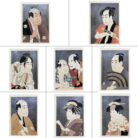 Otte signeret træsnit af Toshusai Sharaku fra Shōwa-perioden, fremstillet i Japan på papir som en del af Ukiyo-e Masterpiece Series III, begrænset udgave og håndtrykte med tesuri-metoden, hver 23 × 33,5 cm med pletter, rynker og skader. Klik på den blå "gå til varen" knap, for at købe eller byde på denne vare. Den samlede pris vil blive vist inden du afgiver dit bud.