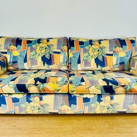 Vintage flerfarvet bomuldssofa fra Nederlandene i god brugttilstand med små tegn på ælde og lette pletter, en 2,5-personer sofa måler 183 cm i bredde, 80 cm i dybde og 86 cm i højde med en siddehøjde på 48 cm. Klik på den blå "gå til varen" knap, for at købe eller byde på denne vare. Den samlede pris vil blive vist inden du afgiver dit bud.