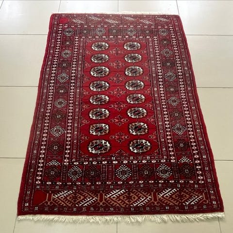 Oprindelsesland: Pakistan; håndvævet orientalsk tæppe i Buchara-stil af uld på bomuld, måler 180 x 125 cm, fremstillet sidst i det 20. århundrede, i god stand med alders- og brugsspor. Klik på den blå "gå til varen" knap, for at købe eller byde på denne vare. Den samlede pris vil blive vist inden du afgiver dit bud.