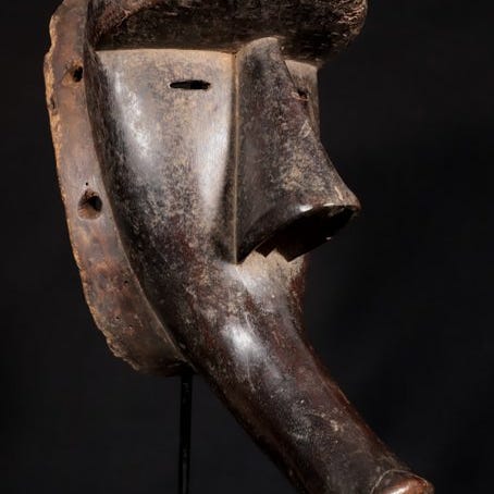 Kran-træmaske fra Côte d’Ivori, ca. 1930–1950, 46 cm høj og 14 cm bred, proveniens belgisk privat samling, ægthedscertifikat; stand ikke inkluderet, specialfremstillet stand kan bestilles. Klik på den blå "gå til varen" knap, for at købe eller byde på denne vare. Den samlede pris vil blive vist inden du afgiver dit bud.