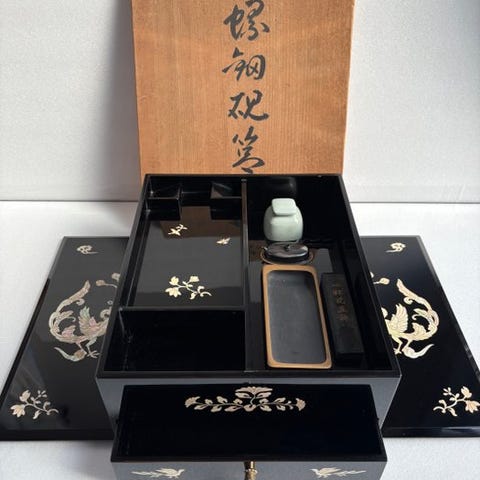 Japansk vintage Suzuribako skriveboks i sort lak med orkidé-maki-e og sølvmonteret rand, mål 12 × 23 × 3,5 cm, vægt 1,5 kg, Showa-perioden (ca. 1930–1960), inklusive blæksten og Suiteki. Klik på den blå "gå til varen" knap, for at købe eller byde på denne vare. Den samlede pris vil blive vist inden du afgiver dit bud.