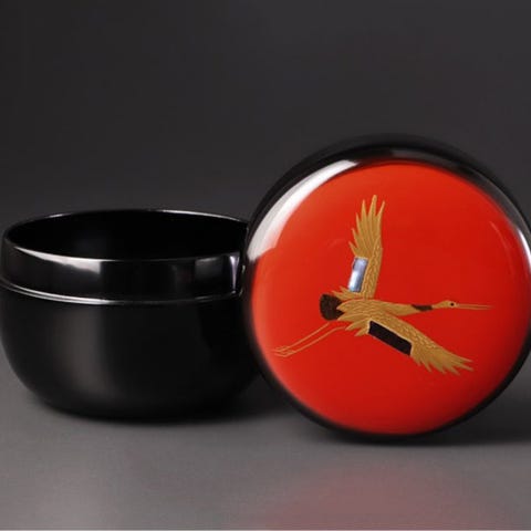 Dette værk, "Pine-Eating Crane" Maki-e Flat Natsume (Japansk thé-ceremoni kedel), af maki-e-kunstneren Nakamura Soin, symboliserer japanske lykkebringende overbevisninger og ånden i teceremonien.