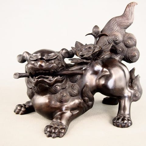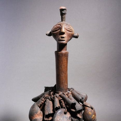 Magnifik slangehoved i bronze fra Yoruba. Denne type værk er typisk for de gamle produktioner fra kongeriget Ifé. Skulpturen er fin og følsom. Arbejdet er detaljeret og udført med bravour. Ansigtet er udtryksfuldt, øjnene er skarpe, den let åbne mund er truende med sine spidse tænder. Hovedets volumen er smukt. Mangler og synlige skader på billederne. Smuk gammel patina. Dette værk er lavet med teknikken cire perdu (se Google), hvilket gør det unikt. Metallet er tyndt, hvilket vidner om skulptørens dygtighed. Nogle mangler og skader er synlige