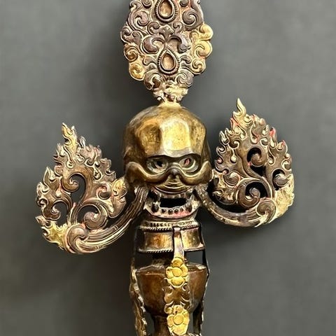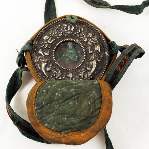 Gau (ga’u o gāu), bærbart tibetansk reliquiarium af kobber og sølvfarget metall, fra det 19. århundrede i Tibet, dimensioner 13 × 11,5 × 6 cm. Klik på den blå "gå til varen" knap, for at købe eller byde på denne vare. Den samlede pris vil blive vist inden du afgiver dit bud.