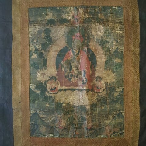 Thangkaen har stadig sin originale silke, der blev brugt til at dække maleriet (i tilfælde af flytning), og dens kobber-tangka-propper, som har en smuk patina.