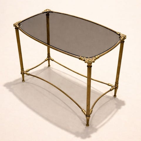 Et par neoklassiske sideborde fra Italien fra omkring 1960–1970, med tungt messingfundament og aftagelige Onyx-toppe (3 cm), ca. 60 × 60 cm (bord 1) og 65 × 65 cm (bord 2), højde 43 cm, vægt ca. 30 kg hver, i god brugt stand med mindre overfladiske ridser. Klik på den blå "gå til varen" knap, for at købe eller byde på denne vare. Den samlede pris vil blive vist inden du afgiver dit bud.