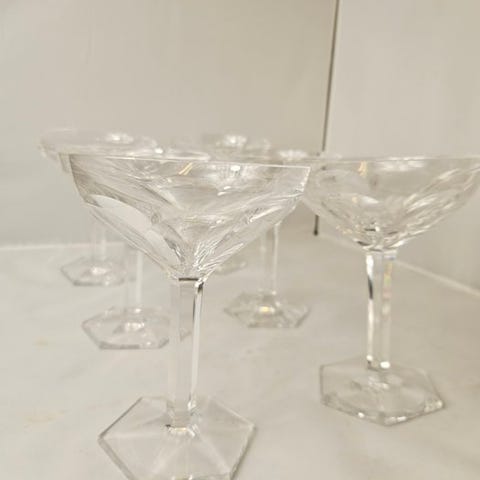 Et raffineret sæt af 7 glas fra Val Saint Lambert, anerkendt for sit enestående belgiske krystalhåndværk. Disse elegante coupeglas afspejler den tidløse sofistikation og den høje kvalitet i produktionen, som Val Saint Lambert er internationalt fejret for.