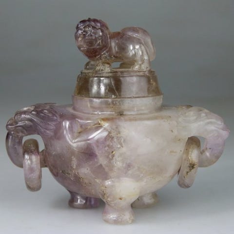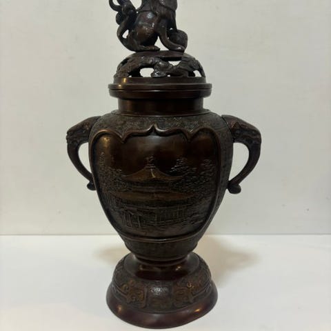 Skulpturen er meget fin: Låget er udskåret som en drage - Håndtagene er udformet som hoveder af mytiske dyr - Bevægelige ringe på håndtagene og på låget