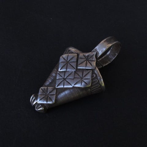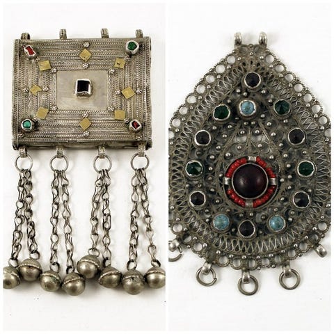 Store berbere/amazigh øreringe, Marokko, tidligt 20. århundrede, sølv, båret som temporals, med central rød glas cabochon som nu er uden farve og nogle hengende mangler; hver ørestillet 11,5 x 7,5 x 1,7 cm, samlet vægt 84,8 g; provenance spansk privat samling. Klik på den blå "gå til varen" knap, for at købe eller byde på denne vare. Den samlede pris vil blive vist inden du afgiver dit bud.