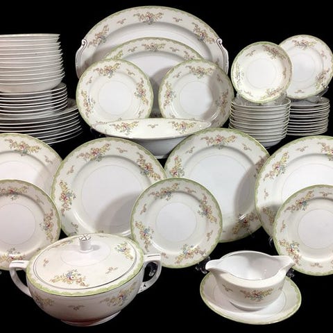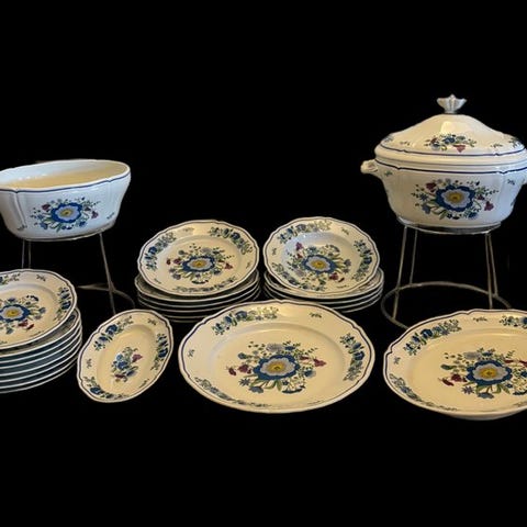 Raffineret bordservise af porcelæn fra Noritake, en historisk japansk producent, internationalt anerkendt for kvaliteten af sin produktion og for elegancen i sine dekorationer. Serviset er beriget af det delikate blomstermotiv Anita, kendetegnet ved små buketter af lyserøde blomster og stiliserede bladdetaljer, harmonisk fordelt langs kanten af elementerne. Dekorationen, sober og romantisk på én og samme tid, er indrammet af tynde linjer, der definerer profilen med stor balance, hvilket giver helheden en feminin, lys og tidløs æstetik, fuldstændig repræsenterende Noritakes smag i andet halvdel af det tyvende århundrede.
