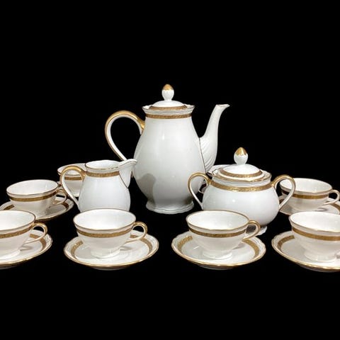 Servise dekoreret med markblomster med guldkant på en bordeaux baggrund, produceret i 1940'erne af det italienske porcelænsfirma Richard Ginori.
