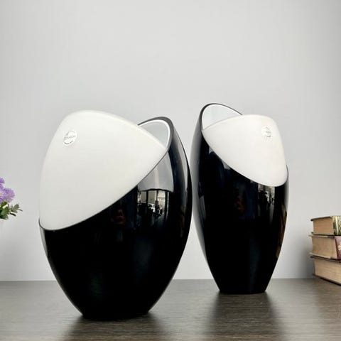 Vasen er fremstillet med den traditionelle Murano-teknik og har et bluino-ydre, en dyb og raffineret blå nuance, der står i kontrast til den rene hvide farve på det opalinfarvede indre. Dette farvespil fremhæver ikke kun vasens rene linjer og grundlæggende form, men skaber også en slående visuel effekt.