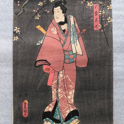 Originalt japansk farvet træsnit (ukiyo-e). Diptyk bestående af to selvstændige blade.
