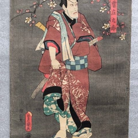 Original japansk farvet træsnit (ukiyo-e) diptych af Utagawa Kunisada (Toyokuni III), med titel Kawarazaki Gonjūrō I. to Iwai Kumesaburō III., fra sen-Edo-perioden (ca. 1850’erne), bestående af to Ōban-ark (samlet størrelse ca. 33,5 × 48,5 cm) i god stand med vedvarende farver og separate ark der ikke er limet sammen. Klik på den blå "gå til varen" knap, for at købe eller byde på denne vare. Den samlede pris vil blive vist inden du afgiver dit bud.