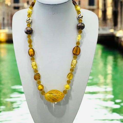 Elegant håndlavet halskæde i Murano-glas, bestående af perler, der er hver enkelt bearbejdet med farverige dekorationer indstøbt i glasset.