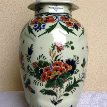 Tre keramikvaser med blomsterdekorationer fra Nederlandene, dateret 1984–1985, i fremragende stand med få brugsspor, med låg 30,2 × 18 cm og uden låg 21 × 13,5 cm. Klik på den blå "gå til varen" knap, for at købe eller byde på denne vare. Den samlede pris vil blive vist inden du afgiver dit bud.