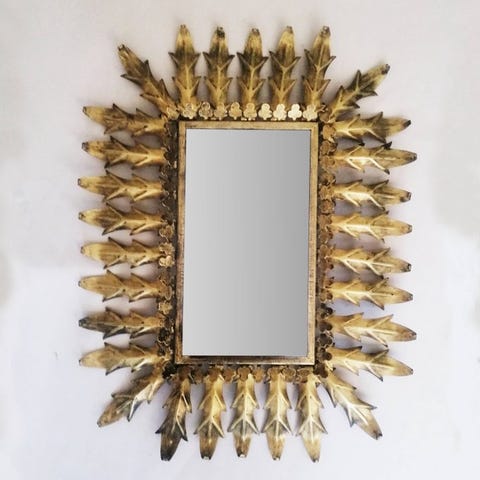 Sol-oval spejl af forgyldt jern med emalje, diameter 44 cm, dybde 4 cm, fremstillet i Spanien, cirka 1950–1960, vintage stil, i god stand med små tegn på brug. Klik på den blå "gå til varen" knap, for at købe eller byde på denne vare. Den samlede pris vil blive vist inden du afgiver dit bud.